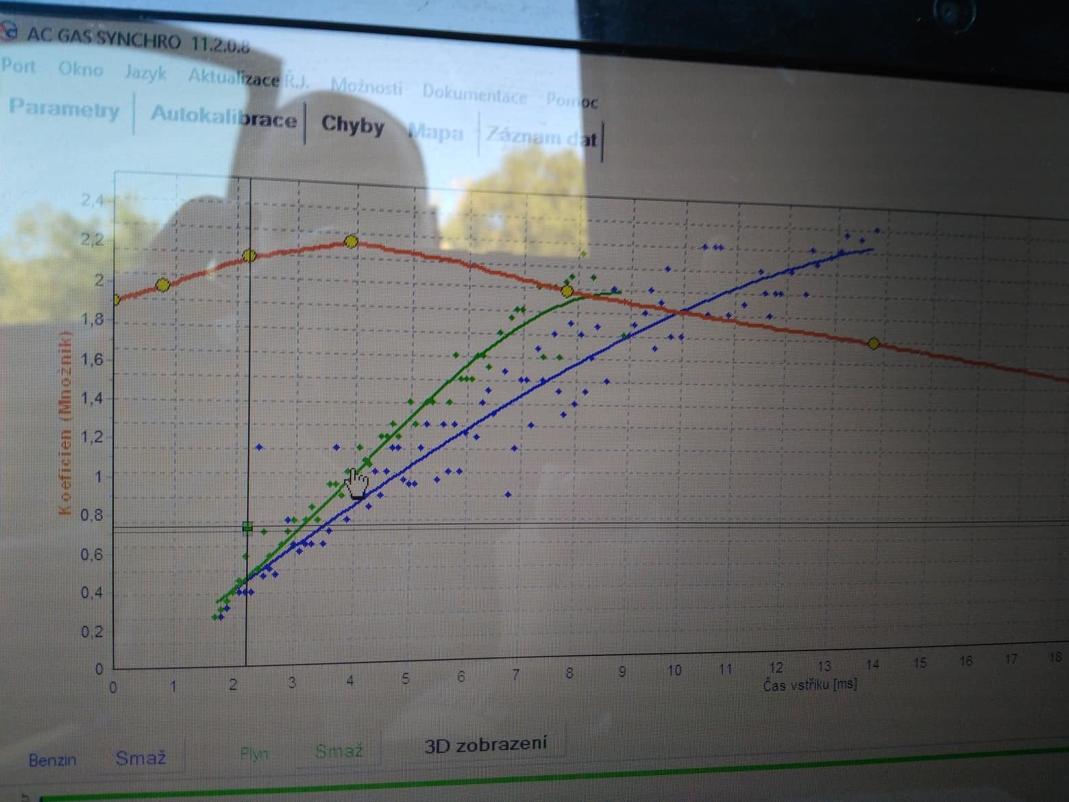 Vždycky se objeví stejná chyba: P0172 - Směs příliš bohatá. Právě když se mi to poprvé od koupě rozladilo, tak to bylo bez autoadaptace a myslel jsem, že po zapnutí se to už dít nebude (ale neumím to nastavit). Majitel předemnou s tím asi tolik nejezdil, protože říkal že mu to vydrželo nastavené i 2 roky a opravoval to jemným posouváním bodů multiplikátoru, nicméně se mi tímto způsobem nepodařilo obě mapy přesně sladit.