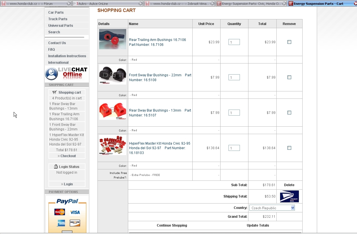no i kdyby to bylo za takovej peníz tak je to dobrý páč tam budu mít komplet na celej podvozek i s těma dodatkama...tady dáš jenom za tu normální sadu 5500 možná i víc...a tady to za 5600 komplet je super...budu muset jít častějš na brigádu a objednat si to..jinak na tuhle stránku sem narazil páč si to chci koupit ale jinak o jiných servrech nevim kde se dá levně z ameriky něco poslat...ale třebas by bylo dobrý s někym se z ameriky domluvit...hodně lidí třebas z aukra posílá věci z ameriky a bydlí tam a po spojených státech je to poštovný zadarmo tak kdyby se mu to podařilo koupit a pak by to jen poslal...ale já si taky myslim že to poštovný je good...ale zase když tam naházíš víc těch věcí tak je poštovný větší, jako se zasíláním balíků u nás..