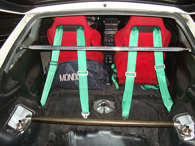 místo klasickýho šroubu co drží zadní pásy v podlaze dáš delší šroub s okem a pás pak protáhneš skrz sedačku