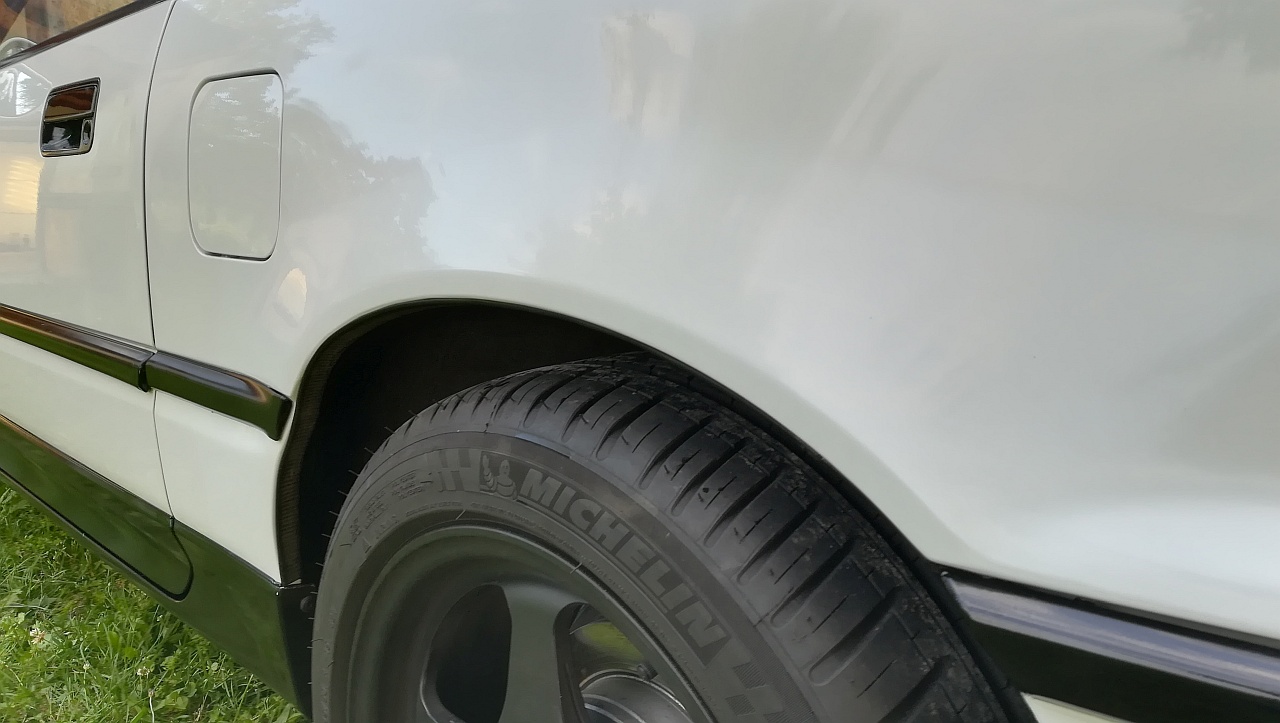 Veškerou korozi sem vybrousil nejvic jak to jen šlo, přestříknul konvertorem rzi, přetmelil, vzal několika vrstvama plniče a zabrousil. Opravený lem sem nalakoval jen rozstřikem do ztracena a né jako celý díl, což by bylo lepší, ale znamenalo by to lakovat třetinu auta a to by s mým zázemím a noob autolakýrnickýma zkušenostma nemuselo dopadnout dobře. Po zabroušení 3000 smirkem pod vodou a rozleštění to vypadá celkem obstojně. Na přímým slunci je sice vidět malinko jiný odstín nový barvy, ale jako oprava na pár let si myslím, že cajk.