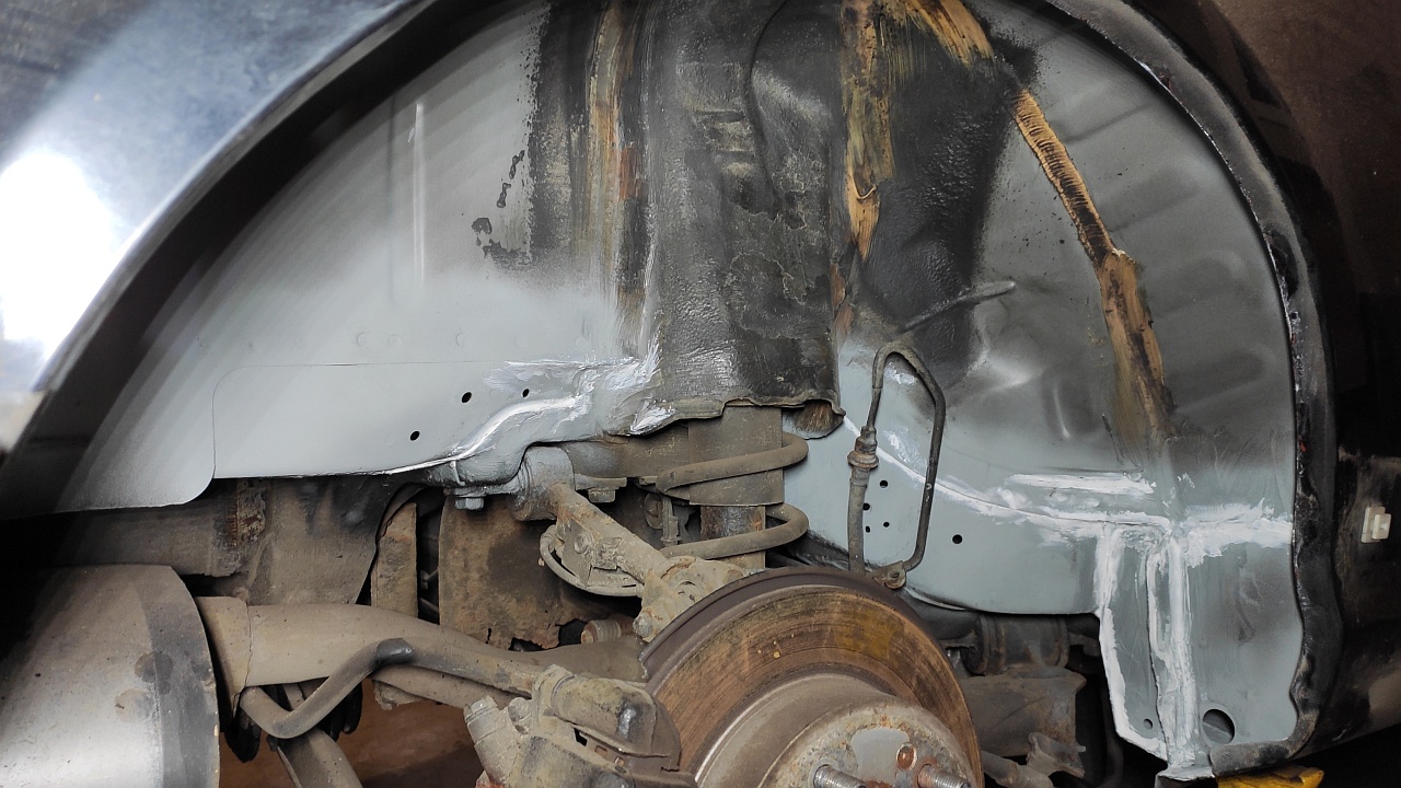 Zadní spolujezdcův podběch byl relativně v poho, takže tam jsem jen odstranil povrchovou rez, přetmelil spáry a vzal to celé bitumenem.