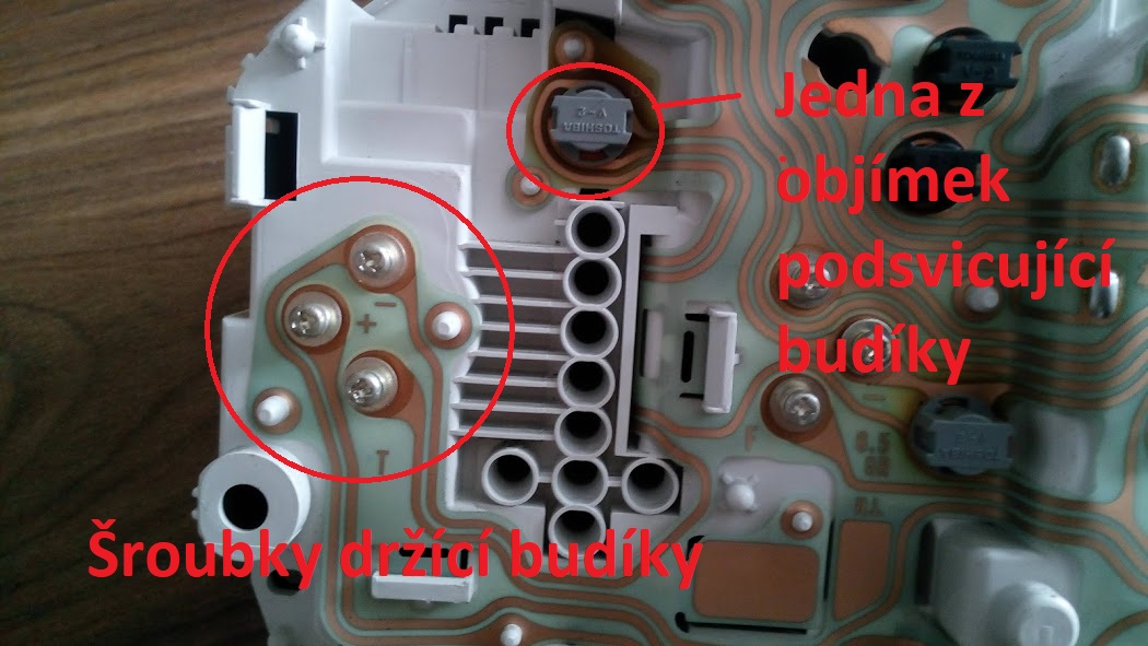 Samotná demontáž budíku je jednoduchá a nehrozí žádné poškození. Po rozdělání asi 6 šroubů, vycvaknutí konektorů od palubky a vyndání samotných budíků z palubní desky potom celá konzole drží na zacvaknutých plastových packách, které se dají snadno vysunout, rozdělat. Nejdříve se rozdělává čirý krycí plast a potom ten černý. Fólie se symboly je jen přitlačena k černému plastu, takže se dají symboly kontrolek snadno vytáhnou a zase vrátit bez nějaké deformace, což je fajn. Jen není dobré je příliš zamastit, umazat prsty. Takže nejlépe uchytit na krajích a položit někam, kde se nezapráší (snadno se na ně chytá prach a pracně se potom čistí benzínem nebo líhem). Samotné 3 budíky drží v konzoli 3 zadními šroubky na plošném spoji, které je potřeba odšroubovat. Tato operace vás asi nemine, protože abychom mohli změnit barvu podsvícení (kvůli tomu to převážně děláme) a intenzitu prosvítání světla, je potřeba seškrábnou tlumící oranžovou fólii. Na tuto operaci zvlášť opatrně! Sdílený budík ukazatele paliva a teploměru je mrcha. Stačí při broušení fólie více zatlačit na ten plast (lehce ho prohnout) a rafička ukazatele se jen protočí a je konec. Už ho zpátky nenakalibrujete Velmi šťastný .Přestane ukazovat teplotu jako mě. U ukazatele paliva to našteští nehrozí a dá se ručička snadno nakalibrovat opatrně prstem dle potřeby..... Takže mě to stálo koupi ještě jednich funkčních budíků a práce navíc. Po druhé se již při vší opatrnosti zadařilo, ale tato operace je vážně hodně pečlivá a vyžaduje opatrnost, jak už tu padlo. A to nemusíme používat zrovna hrubou sílu. Mrk