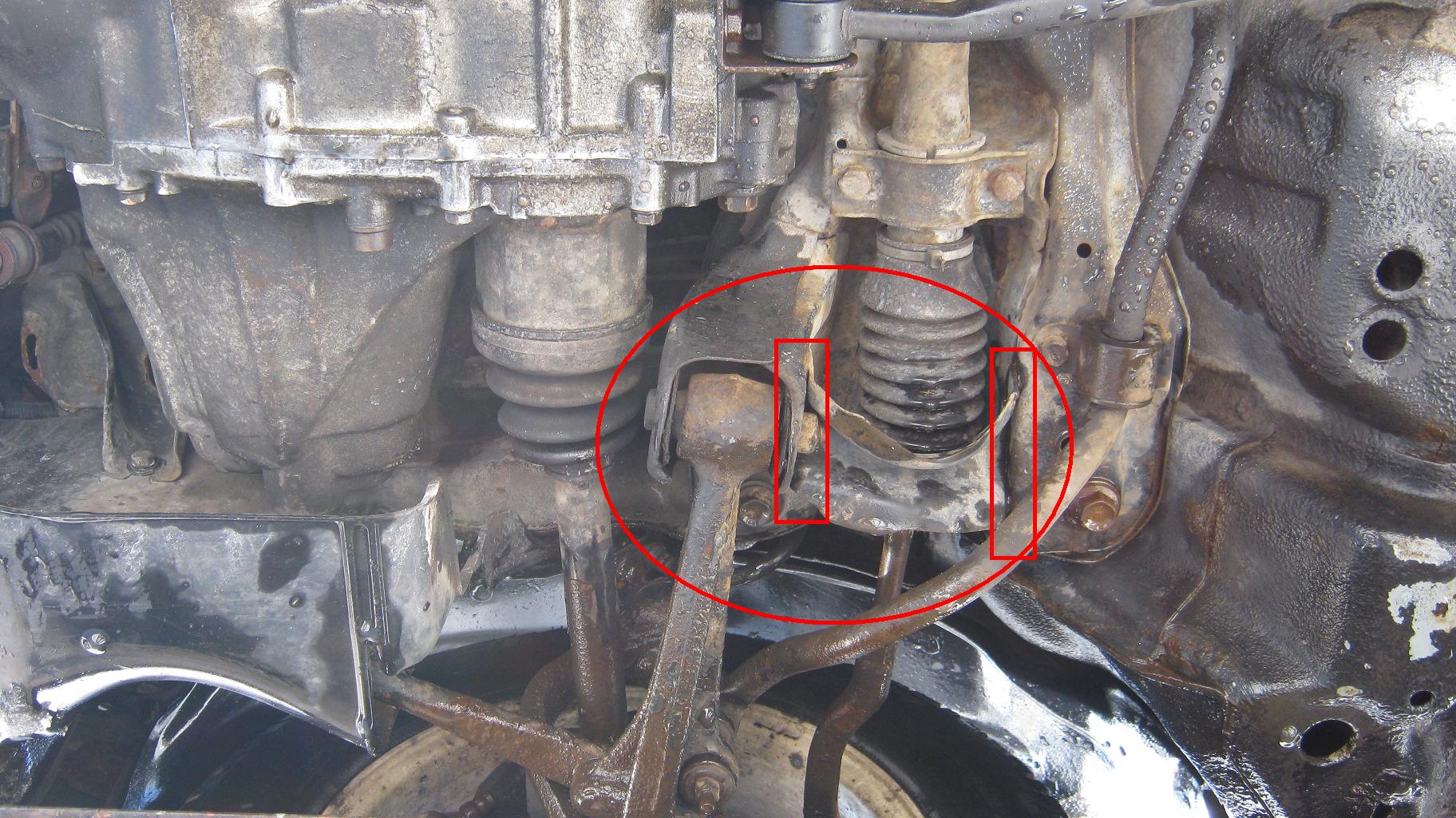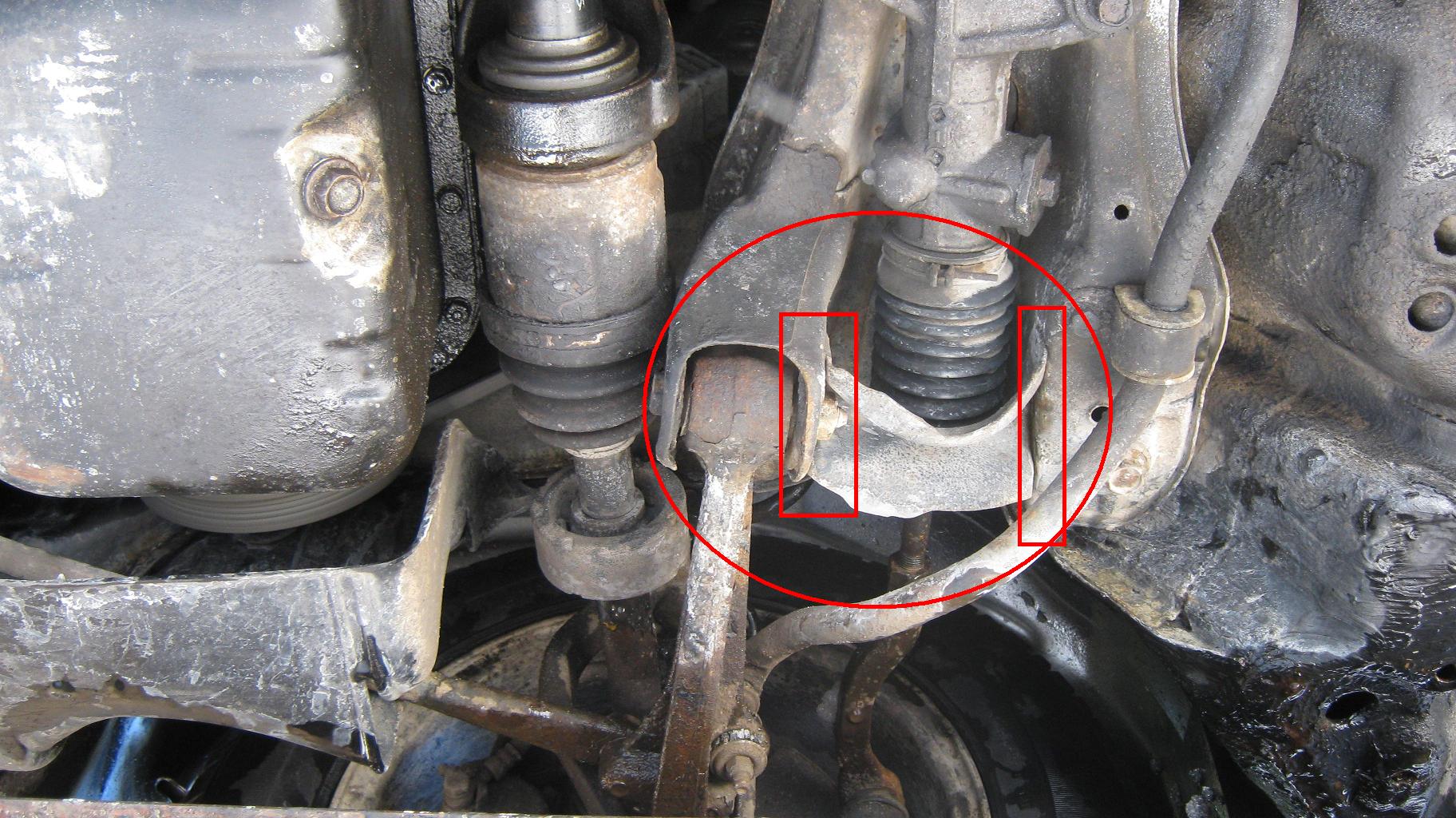 - nejslabší misto na přední nápravě je tedy uchycení spodního ramene v napravnici.