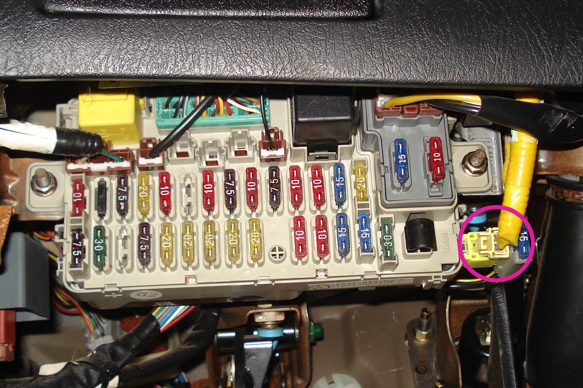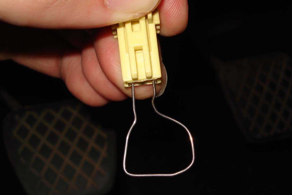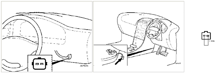 Pod volantem na desce s pojistkama je v držáčku uchycený dvou pinový konektor (prý obvykle) žluté barvy.
