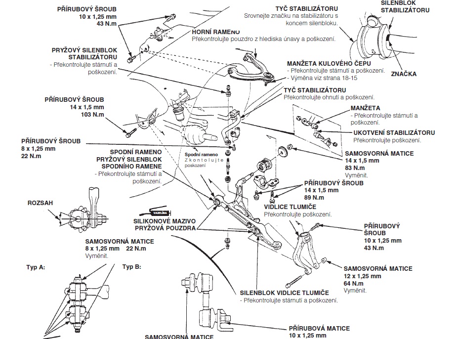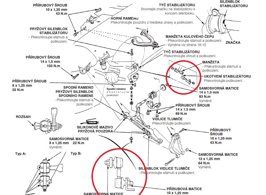 Mám 280tkm a na předku čepy levé i pravé - horní, spodní, čep řízení a na jedné straně ještě axiální táhlo s čepem uvnitř řízení plus siláče stabíku. Na zadek jsem nesahal, zatím drží