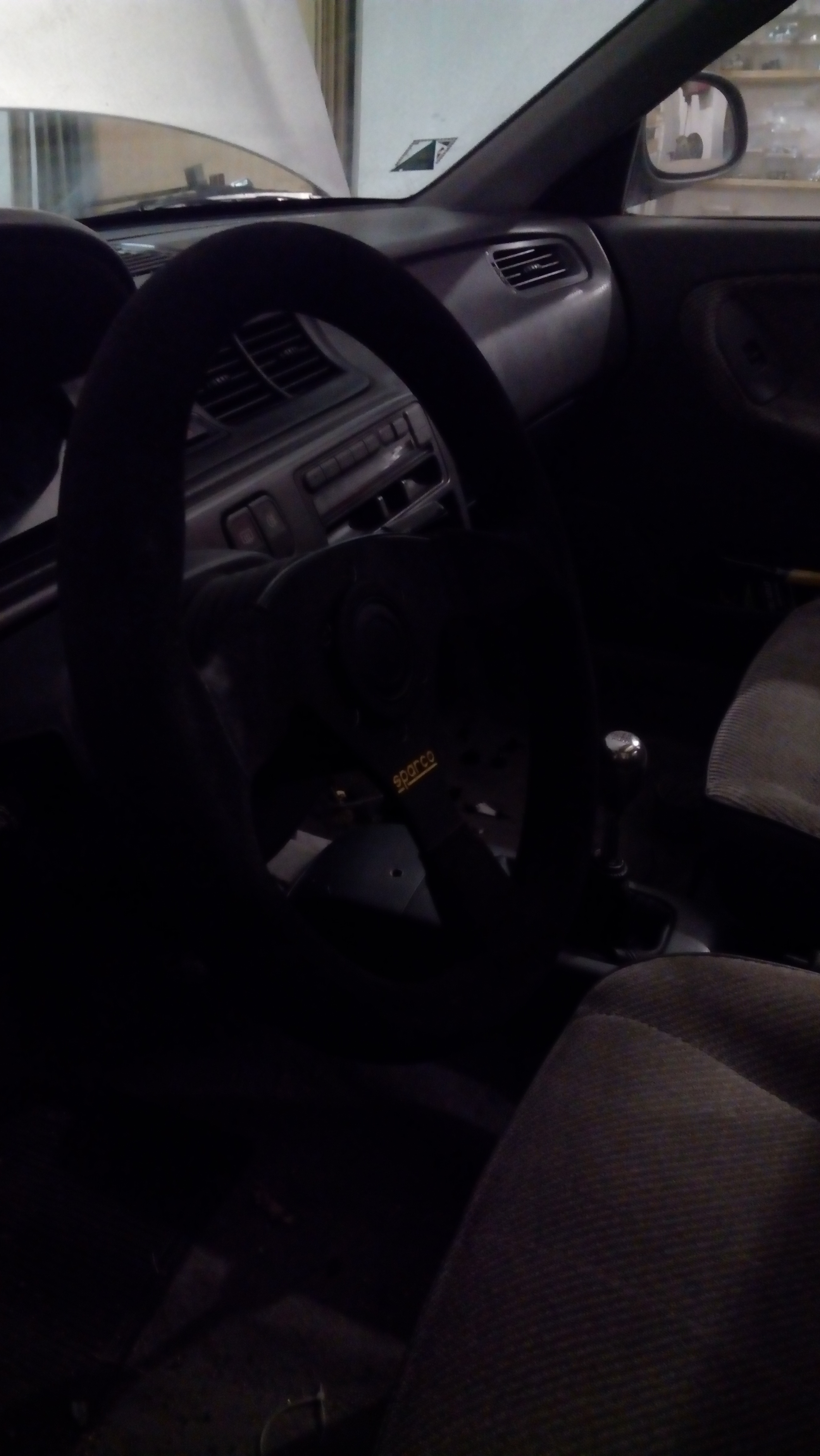 Volant je Sparco, řadička z ITRka. Budíky jsem nechal origo VTI, alespon nebudu točit 9500rpm.. Úsměv