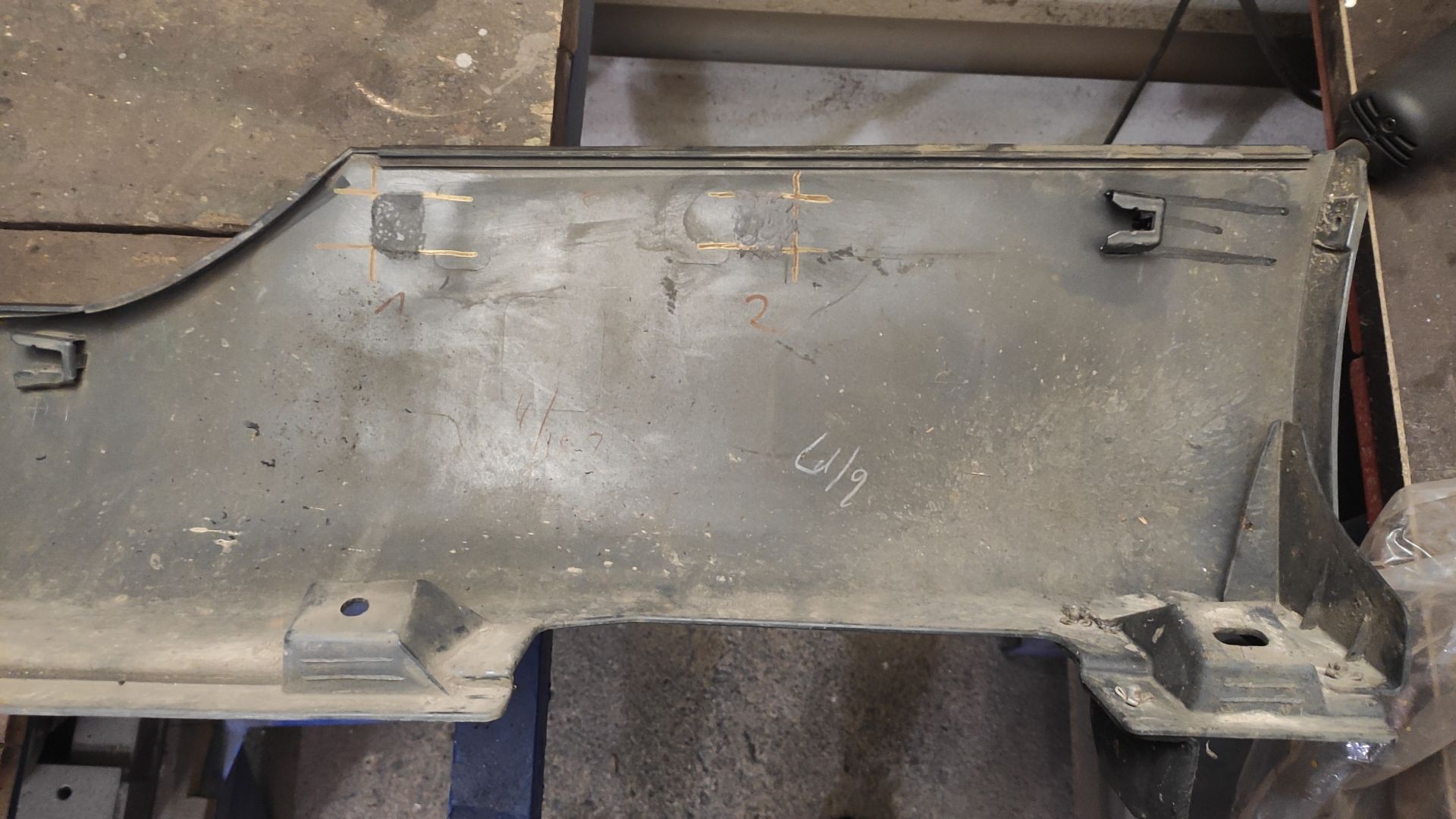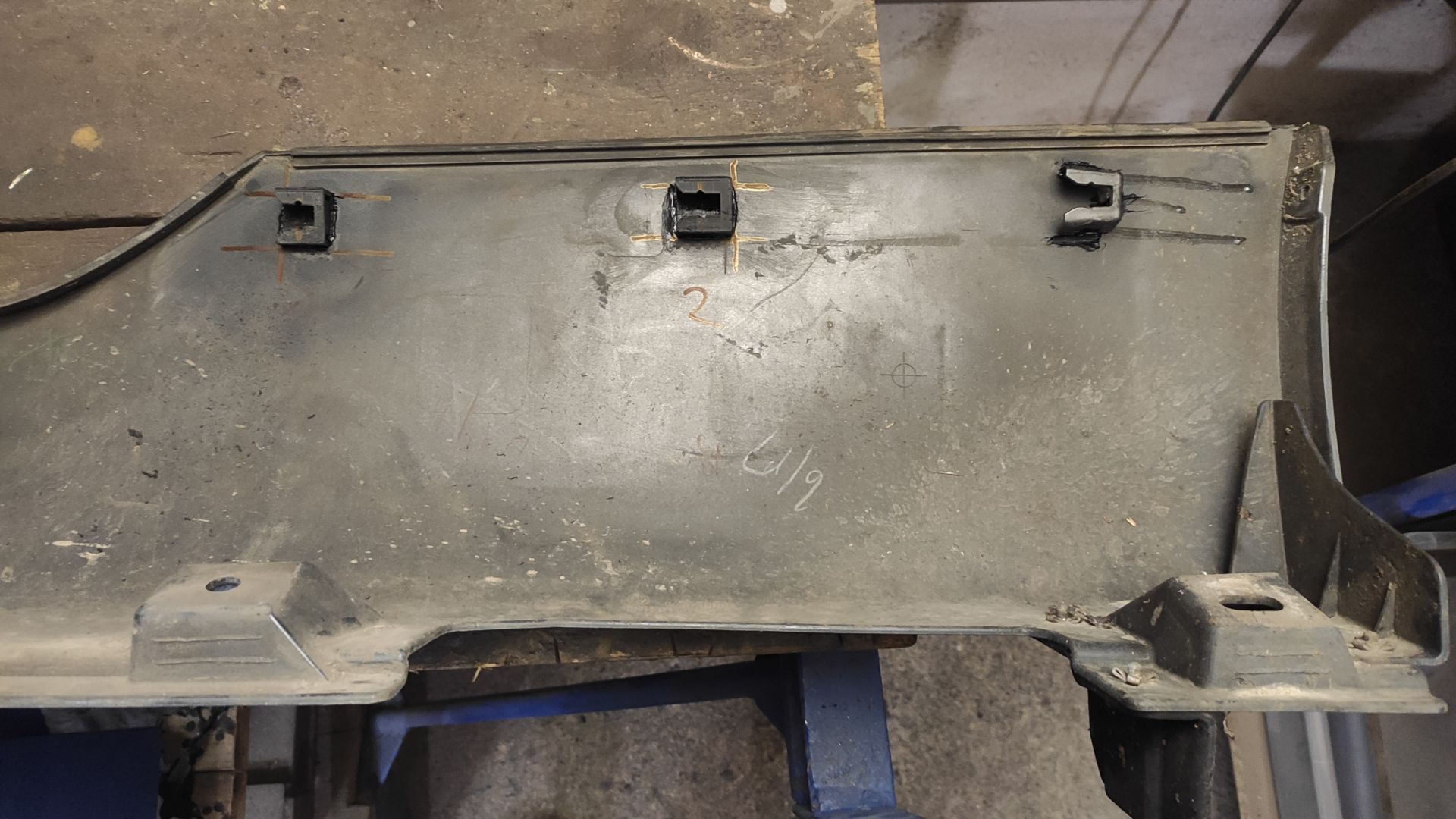 Po původním majiteli byla oprava provedená slepením dílů PU lepidlem, které ale moc nedrželo. Takže jsem lepidlo sundal dolů. Na horním dílu se mi povedlo většinu držáků zavařit a na spodní díl jsem si navrhl a na 3D tiskárně vytiskl nové, které jsme na něj pak nalepil.